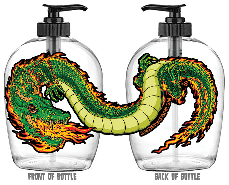 New for Fall 2015....Fire Breathing, Green Dragon! I thought I'd try something new and create a cool wraparound design for this one. I hope my friends back in China like this one! Please note, you are getting an empty, but refillable, soap dispenser with a really cool label and black soap pump. Both the pump and the dispenser are made of plastic. NO SOAP INCLUDED but SHIPPING IS FREE in the continental U.S.