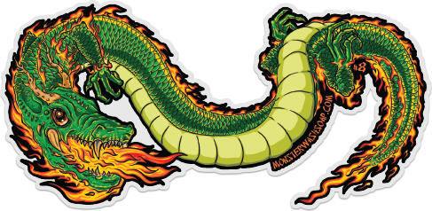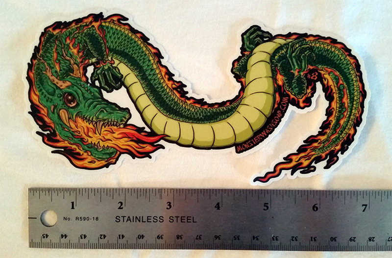 The sticker is a good size at 7 inches wide by 3.5 inches tall at it's maximum area. It's die cut (meaning it's cut to the shape of the dragon, not just a big rectangle or circle) and the areas that you see that are white are actually transparent (except the highlights in his eye). This is a super cool design that looks great and is professionally made and weatherproof.